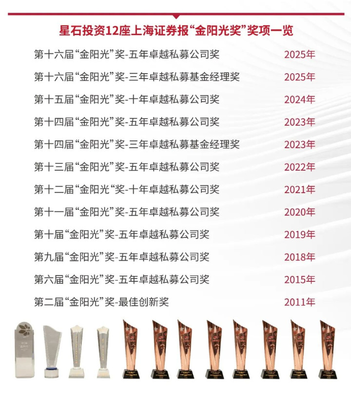截至目前,星石投资共获得了12项“金阳光”奖项,包括“十年卓越私募公司奖”、“五年卓越私募公司奖”、“三年卓越私募基金经理奖”等荣誉大奖。